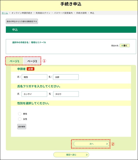 ページの移動は、ページ名(①)のクリック、または「次へ」ボタン(②)、「戻る」ボタンをクリックすることで行えます。