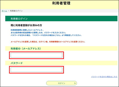 《利用者ログイン画面》 が表示されますので、各処理へ進んでください。