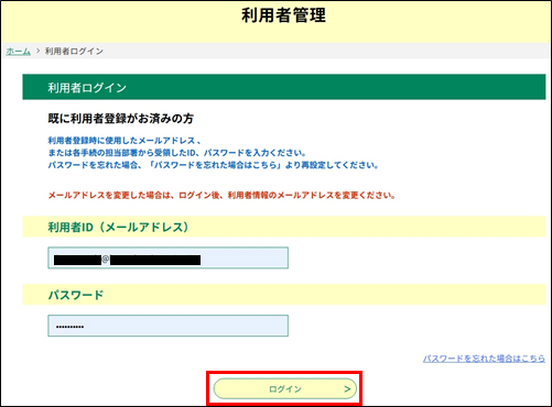 利用者IDを入力してください。 オンライン登録されている方は、連絡先メールアドレスが利用者IDとなります。 ※特定業務用に本サービス提供側から別途発行されている利用者の方は、本サービス提供側からの通知をご覧下さい。 |