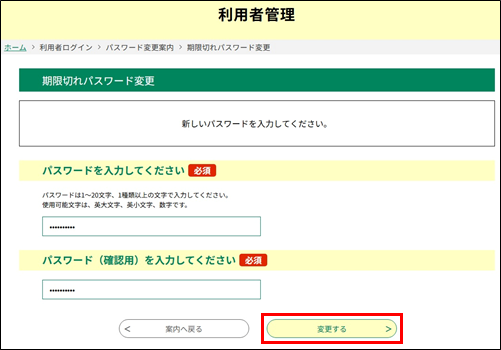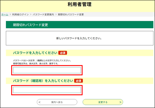 パスワードを入力してください。 セキュリティ上、入力したパスワードは「●」表示になります。 ※システム側の設定によっては、入力規則に変更があります。 |