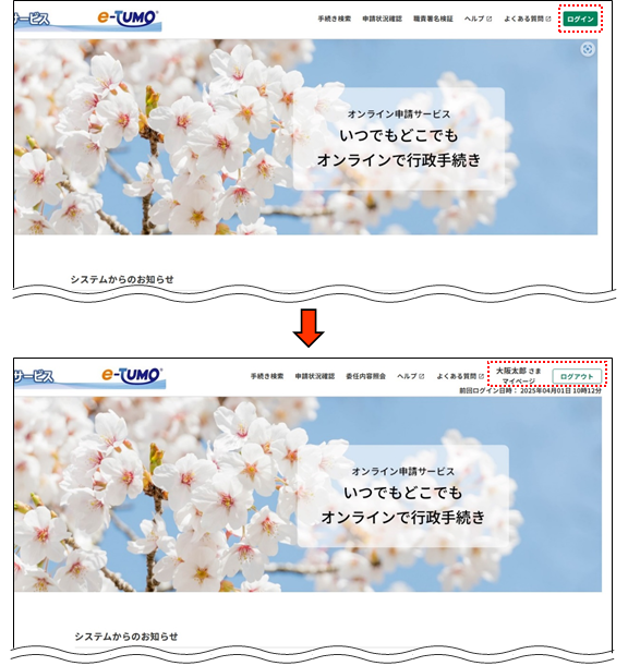 ログイン中は、 各画面の最上部の[メニューエリア] に利用者のお名前と「マイページ」が表示され、ボタン名も変わります。