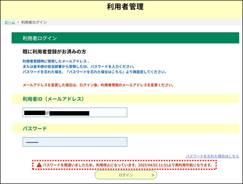 利用停止となった場合、エラーメッセージの時刻になれば利用停止は解除されますが、パスワードを忘れた場合は『 パスワードの再設定 』により再設定を行ってください。