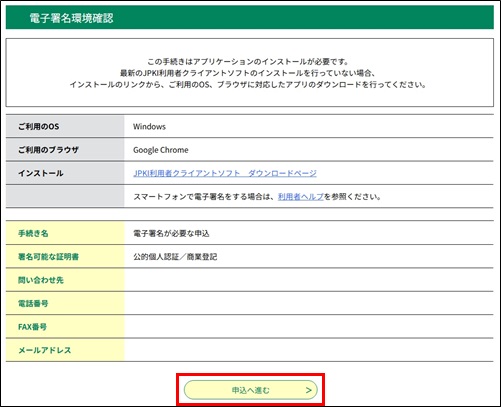 電子署名について重要な説明と注意事項が記載されています。よく読んで「次へ進む」ボタンをクリックしてください。
