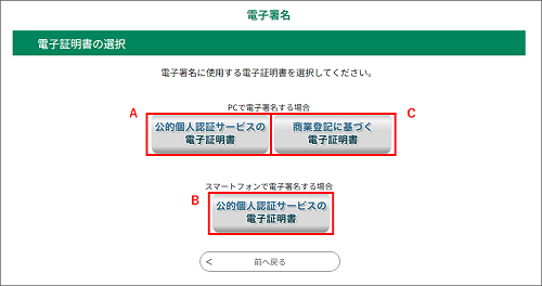 A.パソコンで電子署名する場合、「PCで電子署名する場合」の「公的個人認証サービスの電子証明書」ボタンをクリックしてください。