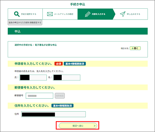 入力後、「確認へ進む」ボタンをクリックすると《申込確認画面》が表示されます。