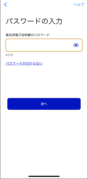 パスワード入力とマイナンバーカードの読み取り マイナポータルアプリの《パスワードの入力》画面が表示されますので、パスワードを入力し、「次へ」ボタンをタップします。