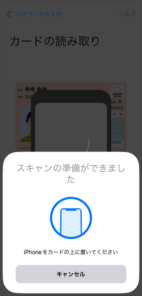 「スキャンの準備ができました」と表示されましたら、マイナンバーカードをセットしてください。