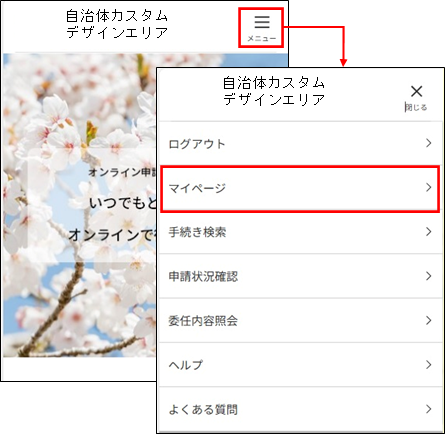 【メニュー】ボタンをタップして表示されるリスト内の【マイページ】メニューをタップします。