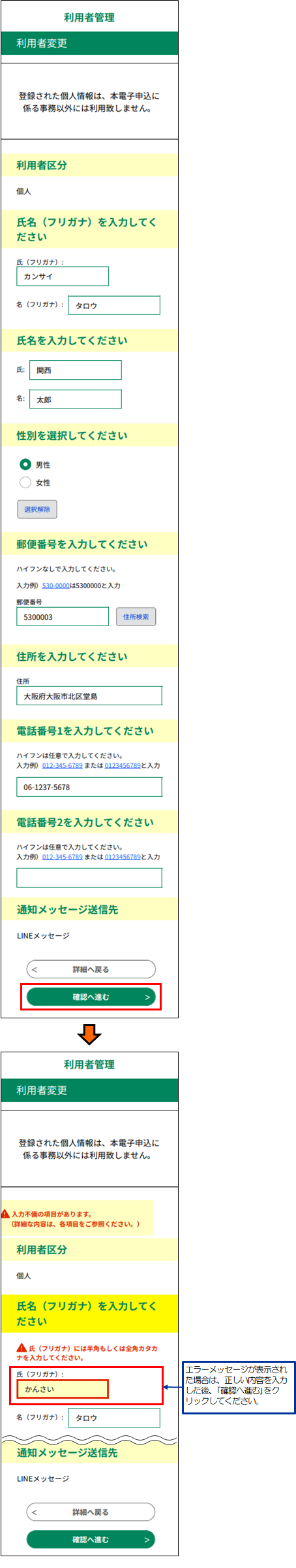 ※ 確認へ進むをクリックすると、自動的に入力内容がチェックされます。
