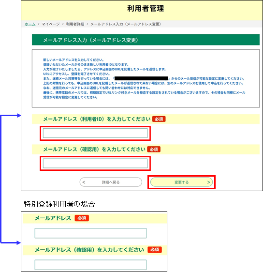 本サービスにおける利用者ID として設定されたメールアドレスに変更があった場合は、至急この変更を行うようにしてください。