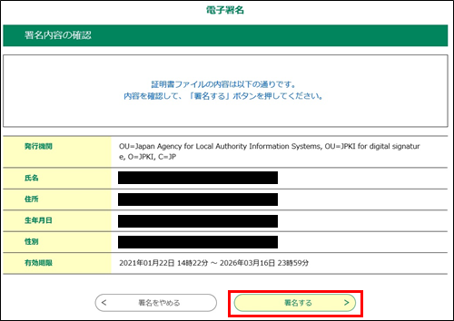 内容に間違いがなければ、「署名する」ボタンをクリックしてください。