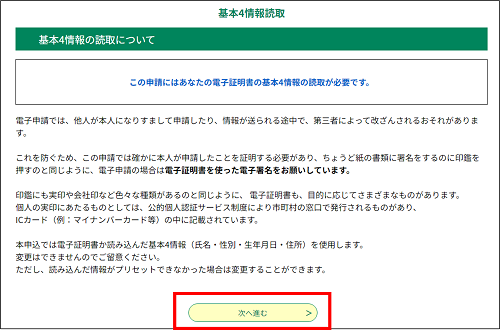 基本4情報読取について重要な説明と注意事項が記載されています。よく読んで「次へ進む」ボタンをクリックしてください。