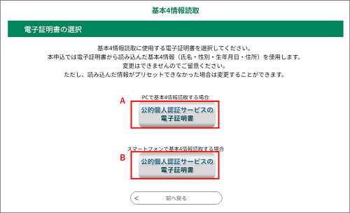 B.スマートフォンで基本4情報読取する場合、「スマートフォンで基本4情報読取する場合」の「公的個人認証サービスの電子証明書」ボタンをクリックしてください。