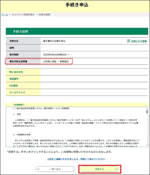 電子署名が必要な手続きの場合、手続き説明画面に「署名可能な証明書」欄と必要な電子証明書が表示されます。