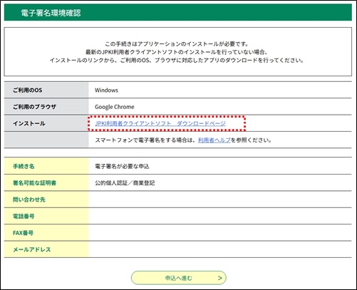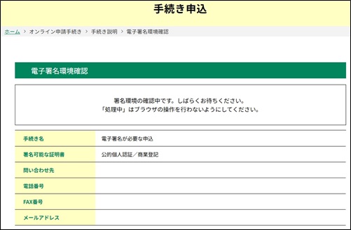 使用しているパソコンの電子署名環境の確認が行われます。ただし、確認作業が瞬時に終わると表示されないことがあります。