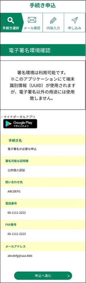 《電子署名環境確認》画面で「申込へ進む」ボタンをタップします