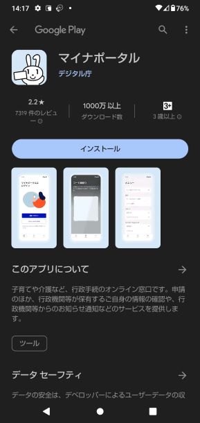Google Playの「マイナポータル」ページが表示されますので、インストールボタンをタップしてインストールを行います。