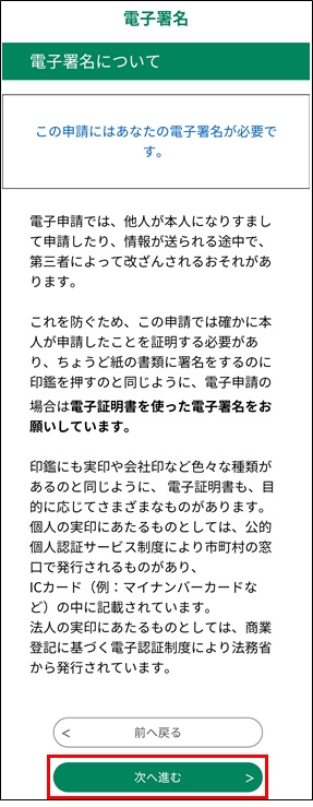 《電子署名について》画面が表示されたら、「次へ進む」ボタンをタップします。