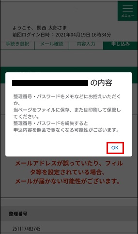 《申込完了画面》に遷移する際に、整理番号とパスワードを控えていただく旨のポップアップメッセージが表示されますので、