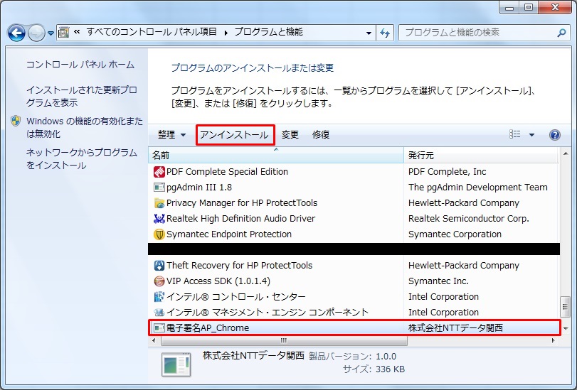 電子署名APのアンインストールが完了したら、《プログラムと機能》画面に戻ります。