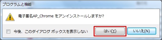 《電子署名AP_Chromeをアンインストールしますか?》画面が表示されたら、「はい(Y)」ボタンをクリックします。