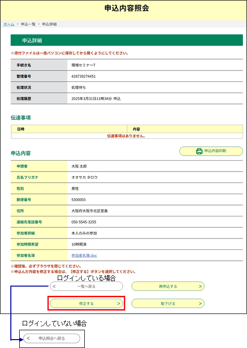 ※ログインしていない場合は、下部のメニューボタンには 一覧へ戻る ではなく、 申込照会へ戻る が表示されます。