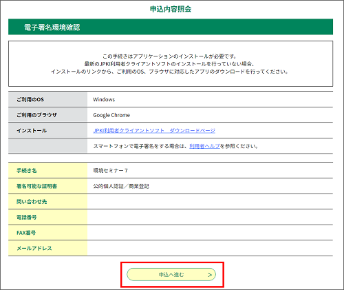 電子署名環境が整っている場合は、 申込へ進む をクリックしてください。 《申込変更画面》 が表示されます。