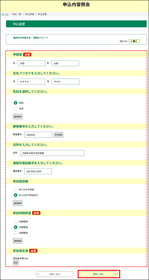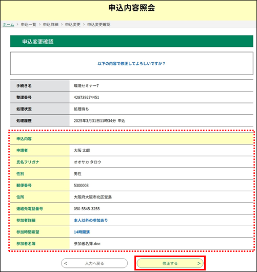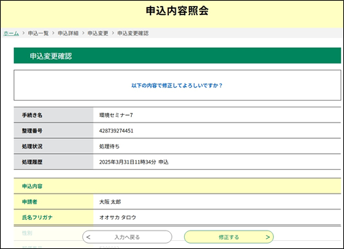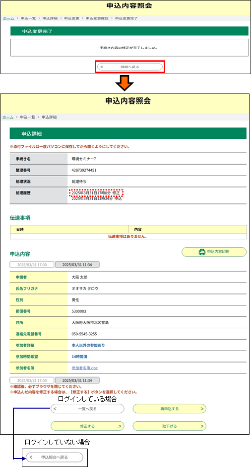 詳細へ戻る をクリックすると、 [処理履歴] に変更結果の反映された 《申込詳細画面》 へ戻ります。