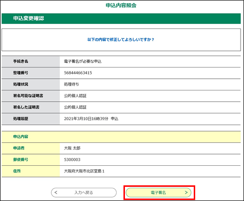 電子署名が必要ない手続きの場合は、 《申込変更画面》 が表示されますので、 「 手順 4 」へ進んでください。