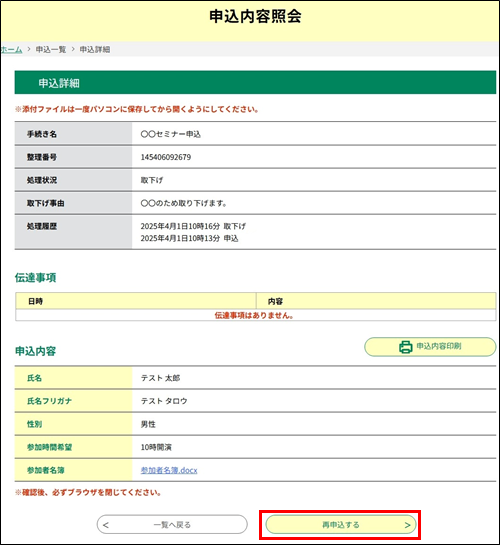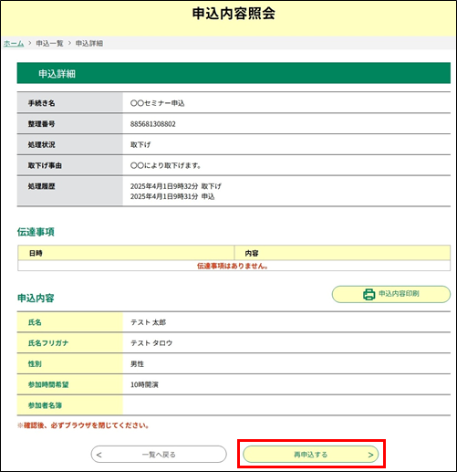 ※再申込は、返却中の申込を修正し再提出する操作ではありません。 返却中の申込を修正し再提出する場合は、申込変更を行ってください。(詳細は、『 申込変更 』を参照してください。)