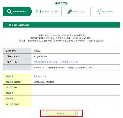 電子署名環境が整っている場合は、 申込へ進む をクリックしてください。基本4情報読取が必要な手続きの場合は 基本4情報読取《申込画面》 が表示されます。