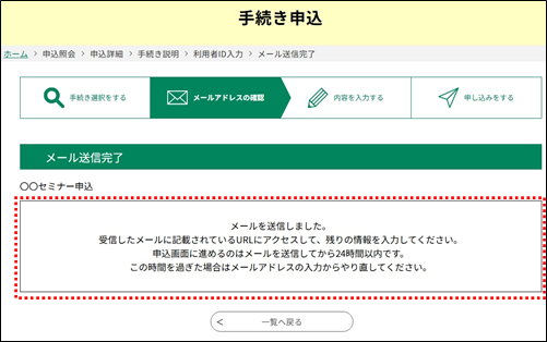 《メール送信完了画面》 が表示され、連絡先のメールアドレスへ URL を記載したメールが送られます。