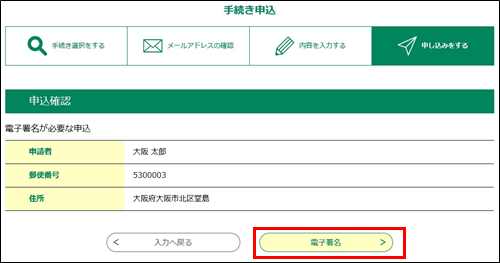 電子署名が必要な手続きの場合は、 電子署名 をクリックします。 電子署名の操作が始まりますので、以降の操作は(『電子署名』の『 公的個人認証による証明書の電子署名 』の 手順7 または『電子署名』の『 商業登記に基づく証明書の電子署名 』)の 手順3 以降を参照してください。