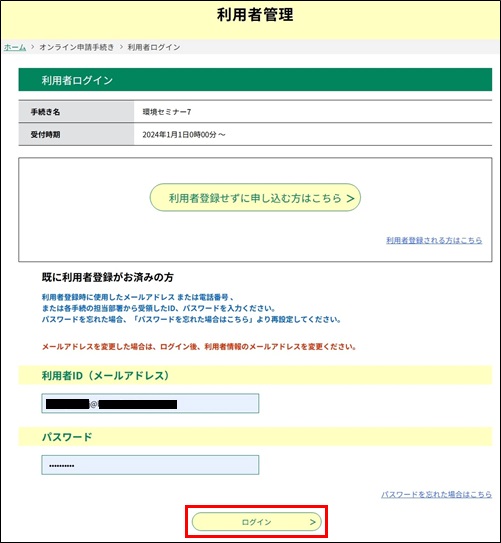 本サービスへのログインを確認するため、 《利用者ログイン画面》 が表示されます。