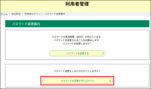 パスワードが有効期限切れの場合は 《パスワード変更案内画面》 が表示されます。