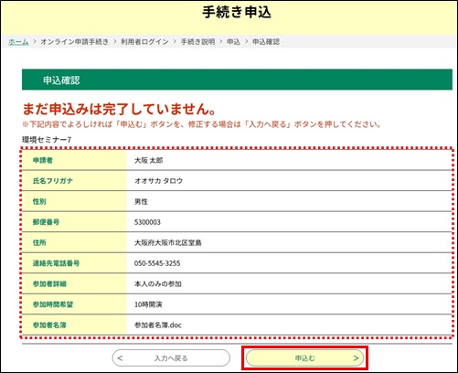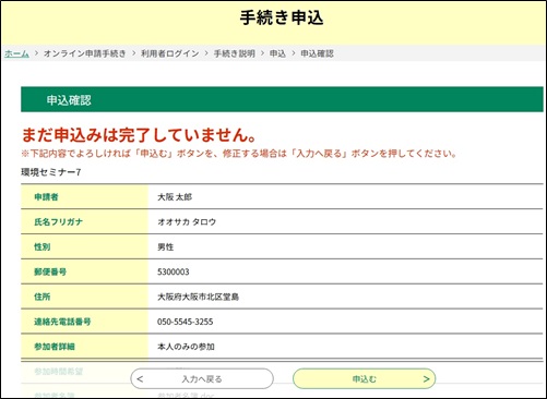 《申込確認画面》 が表示されます。