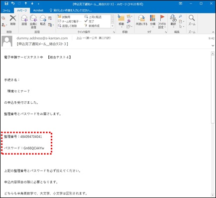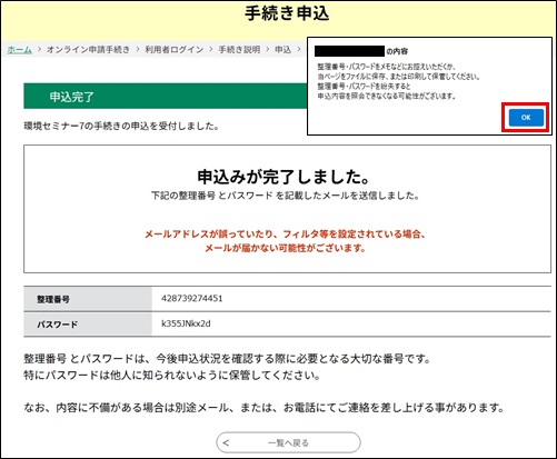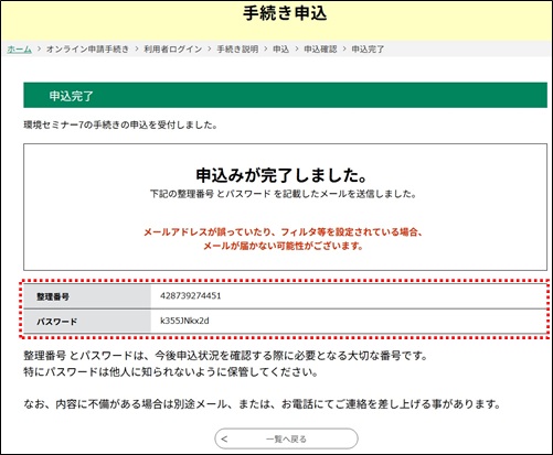 ●メールアドレスの入力が必要な申込については、 [整理番号] と [パスワード] が発行され、【申込完了通知メール】またはSMS通知メールが送られます。ご確認ください。