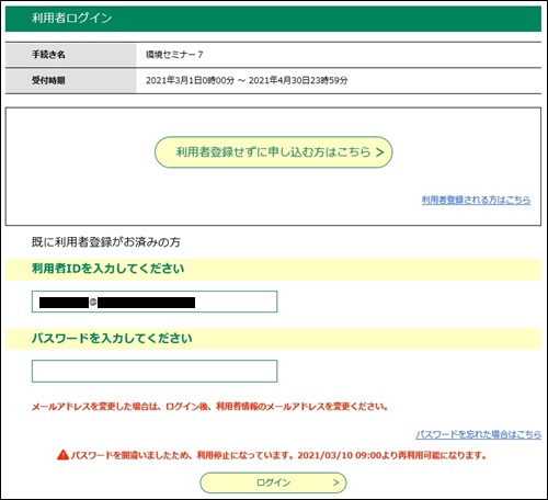 最大申請者数が設定されている手続きでは、手順2で入力した利用者IDが既に申込済みの利用者IDと重複していると、