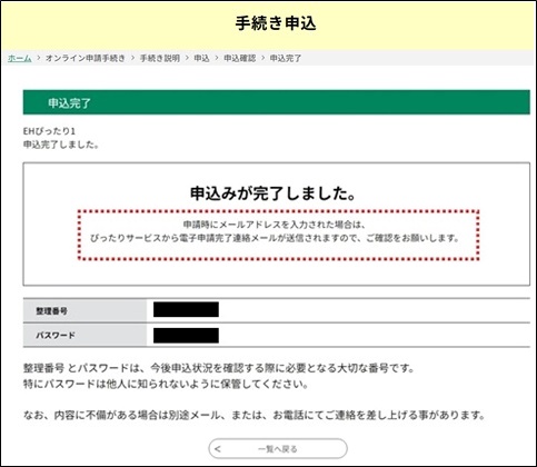 以下のような《申込完了画面》が表示され、ぴったりサービスから申込完了通知連絡メールが送られる旨の文言が表示されます。