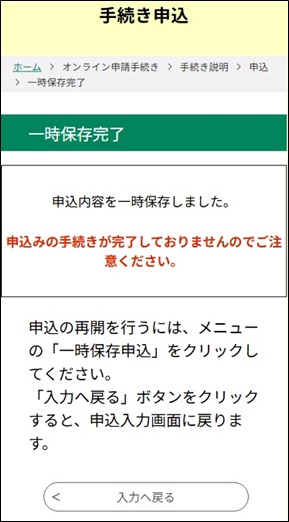 また、一時保存から再開した申込が完了すると、一時保存データは削除されます。