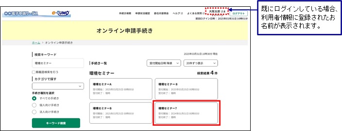 また、ログイン済の状態で手続き名をクリックして《手続き説明画面》に遷移した際に