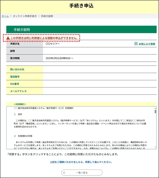 《手続き説明画面》に遷移したときに、下図のような重複エラーメッセージが表示され、「同意する」ボタンは表示されず申込はできません。