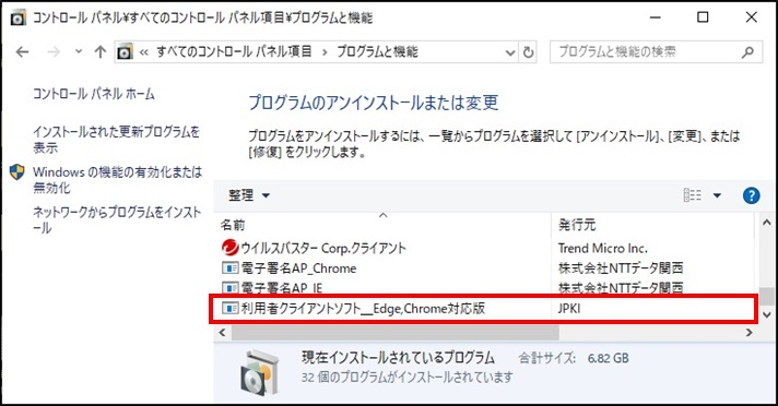 「利用者クライアントソフト_Edge,Chrome対応版」がインストールされているか確認します。  インストールされていない場合:「3.利用者クライアントソフトのインストール方法(Windows、Mac)」へ