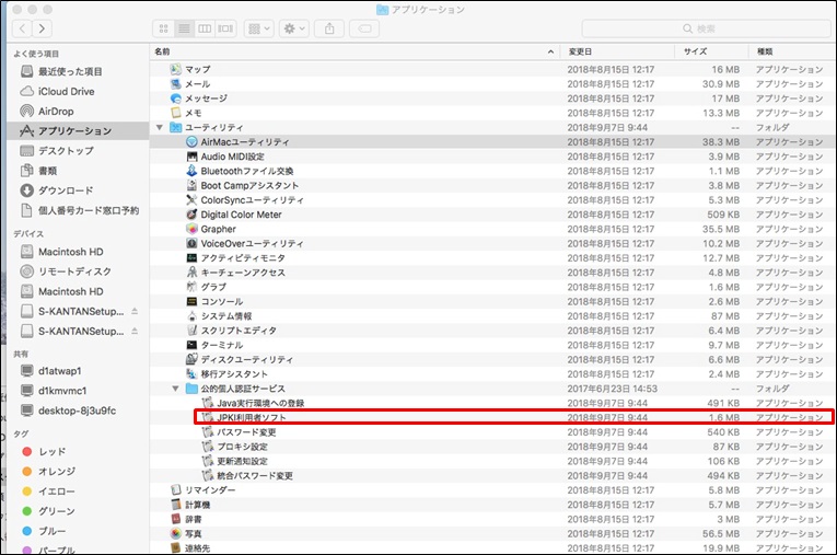 アプリケーションを開いてJPKI利用者ソフトがインストールされているか確認します。
