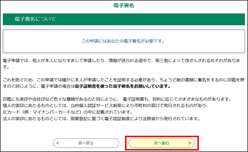 電子署名について重要な説明と注意事項が記載されています。よく読んで「次へ進む」ボタンをクリックしてください。