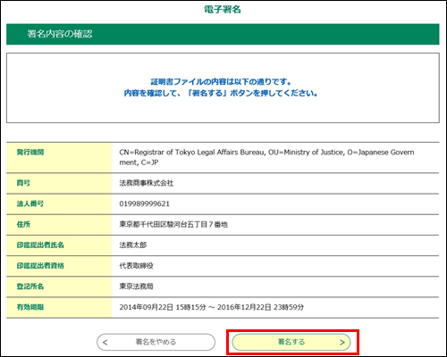 内容に問題がなければ、「署名する」ボタンを押してください。