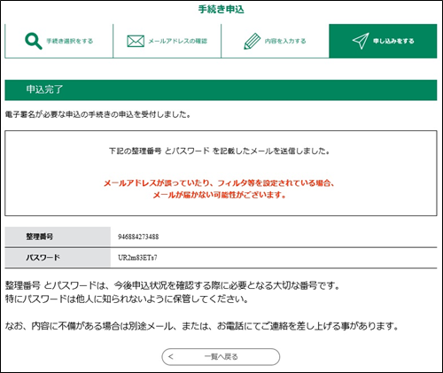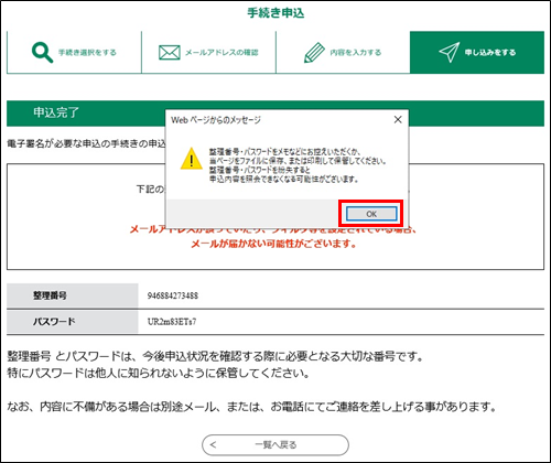 「署名する」ボタンをクリックすると署名が行われ、署名が完了すると整理番号とパスワードを控えていただく旨のポップアップメッセージが表示されます。