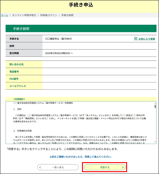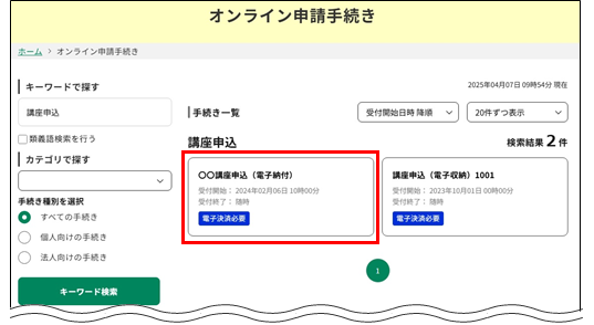 基本的な操作としては、検索によって申込を行う手続きを一覧から選択し、必要事項を入力して申込を完了します。
