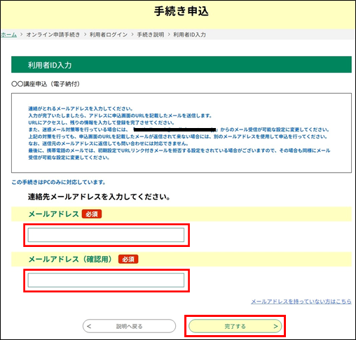 連絡先となるメールアドレスを入力してください。 ※入力するメールアドレスが既に [利用者登録] されていた場合でも、ログインして手続き申込を進めることができます。 (詳細は、手順5 の『MEMO<入力したメールアドレスが登録済だった場合>』を参照してください。) |