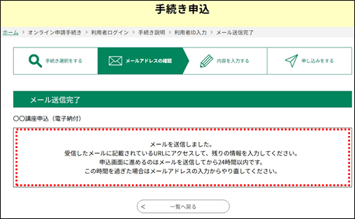 《メール送信完了画面》 が表示され、入力した連絡先メールアドレスに URL を記載した【連絡先アドレス確認メール】が送られます。